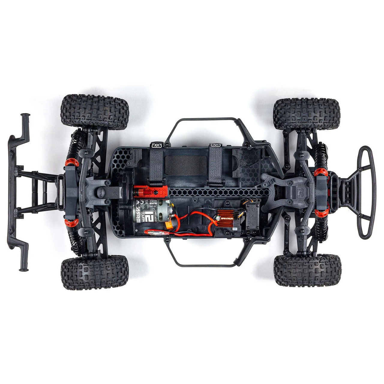 The self-bleeding, oil-filled shocks with silicone O-rings use a tried and tested, coil-over design for effortless maintenance and amazing handling. Their innovative rod-end has a molded-in spring perch for extra toughness. High chassis guards limit the amount of dirt and debris that can get into the chassis tub. Shock-absorbing loops keep the front and rear bumpers secured to the chassis, offering defense against heavy impacts.
