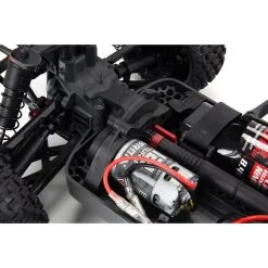 The self-bleeding, oil-filled shocks, now with silicone O-rings, use a tried and tested, coil-over design for simple maintenance and amazing handling. Their innovative rod-end has a molded-in spring perch for extra toughness. High chassis guards limit the amount of dirt and debris that can get into the chassis tub. Side impact nerf bars further protect the chassis and body shell. Shock-absorbing loops keep the front and rear bumpers secured to the chassis, offering defense against heavy impacts.