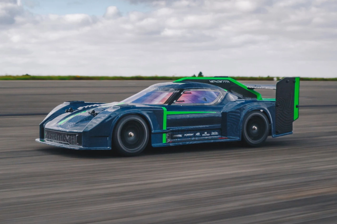 The aerodynamically tuned VENDETTA™ Speed Racer body includes tough high and low downforce wings. It’s available factory-finished in your choice of stunning green or blue matte and gloss effect paint schemes with scale decals. The body features fender vents to relieve built up air pressure from inside the body to reduce aerodynamic lift and reduce drag. Aerodynamics at work. At the high speeds the VENDETTA™ Speed Racer can achieve, the aerodynamic elements play a significant part in the performance of the vehicle. The huge rear diffuser, rear wing and wing endplates ensure the VENDETTA™ Speed Racer is stable at all speeds.