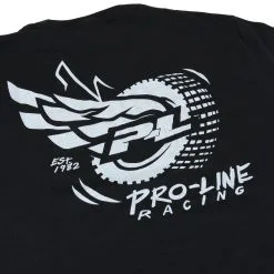 This is a Pro-Line Wings Black T-Shirt. Introducing the new Pro-Line Wings Black T-Shirt! This ultra-soft ring spun cotton/poly blend T-Shirt features a moto-style design with winged rendition of our iconic Hole Shot tire. This special logo is featured across the center of the back and a small version is on the front left chest area. Get your new Pro-Line Wings T-Shirt now!