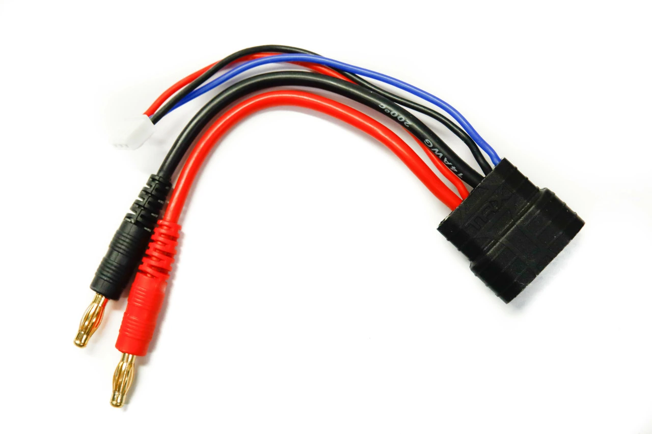 This is a Punisher Series 2S Battery Charge Adapter Cable. It has 4mm Bullet connectors on one end and a Traxxas ID connector on the other. This charge adapter is used to charge Traxxas 2s batteries with the Traxxas ID plug on any charger that uses 4mm bullet outputs.