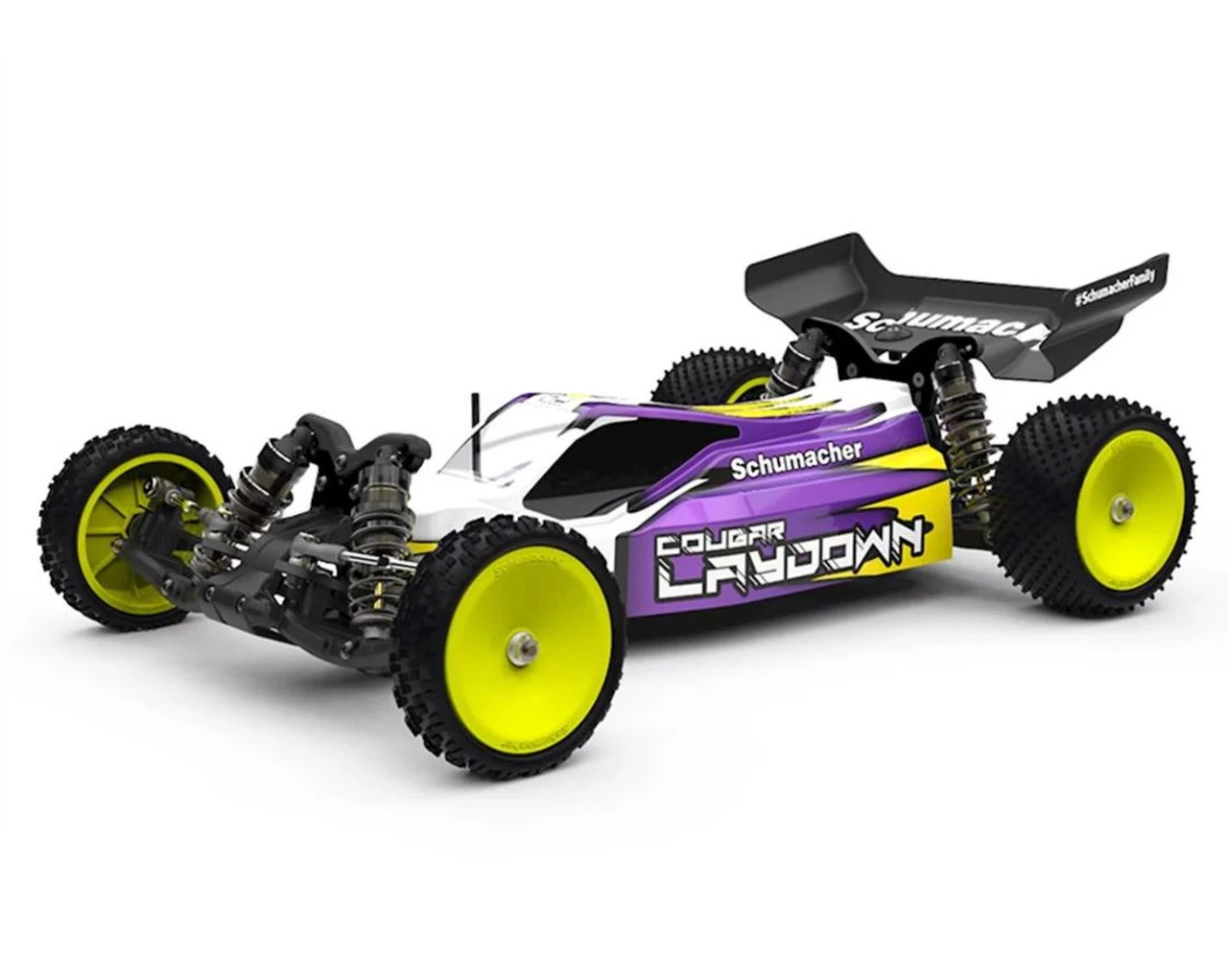 The Schumacher Cougar Laydown 2WD 1/10th Off-Road Competition Buggy Kit is a versatile platform, that offers outstanding performance on a wide range of grip levels, from carpet, astro and dirt. The Laydown has been developed by the Schumacher Engineering and racing team to be lower, lighter, easier to maintain, and faster! With decades of race winning knowledge and experience, every detail of the Laydown has been scrutinized to make a fast, easy to drive, and user friendly 2WD buggy that can take you to the top of the podium.