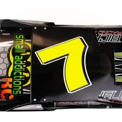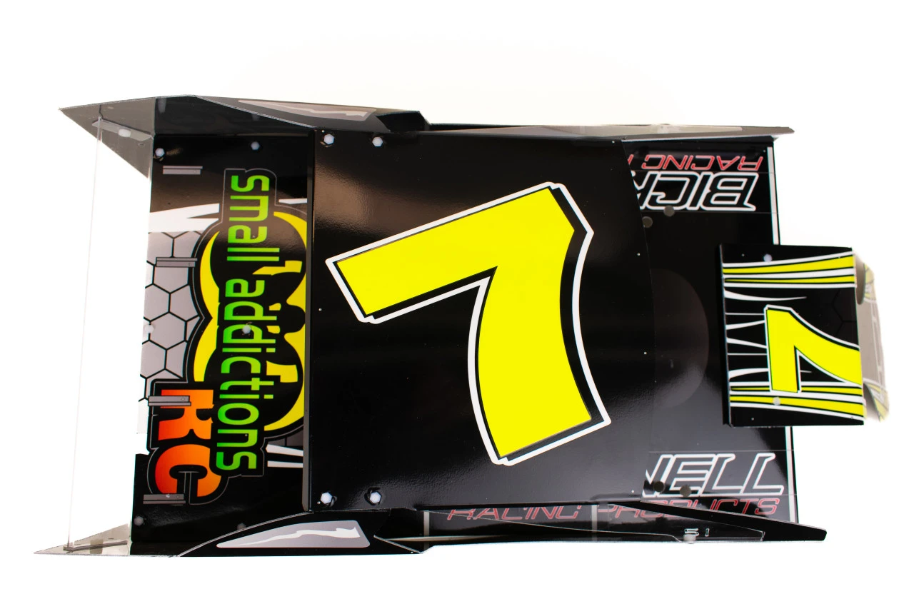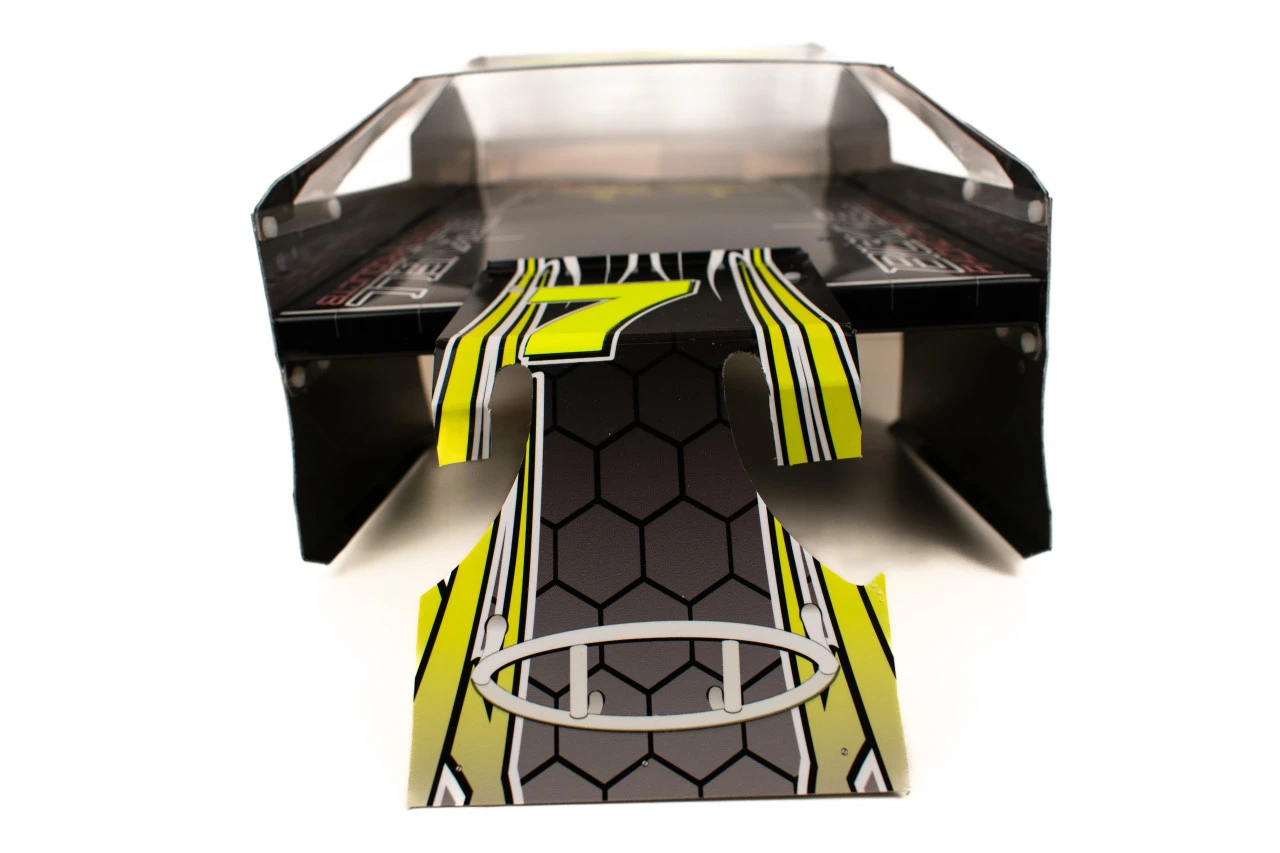 Make your MudBoss stand out from the crowd with this eye pleasing, high quality, custom Body Wrap printed on automotive grade vinyl to fit the Salvas Style MudBoss Body. Laminated with 3.5 mm gloss vinyl this wrap is durable yet light weight, pre-cut and slightly oversize to help fit the Salvas Style bodies like a glove, and is easy to apply. The number 7 is a bright fluorescent yellow.Â