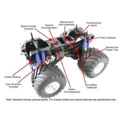 The Super Clod Buster is equipped with two motors and tightly sealed gearboxes that have been molded as one piece with axle housing. Minimum power loss and smooth cornering are obtained thanks to a gear train transmission and differentials. The included Dual Motor ESC provides ample power to get your truck over obstacles. Furthermore, this monster truck is also equipped with a 4WS system for 4-wheel drive steering. This feature makes tight cornering with such a big machine easy!
