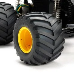 The durable and easy-to-assemble 2WD chassis employs a box type frame, front swing arm independent and rear rolling rigid suspension. Big 115mm diameter semi-pneumatic tires on yellow wheels offer dynamic running on even the toughest of surfaces. The sealed gearbox protects diff gear from dirt and sand during off-road driving and a rear mounted wheelie bar enables wild wheels in the air stunt driving.