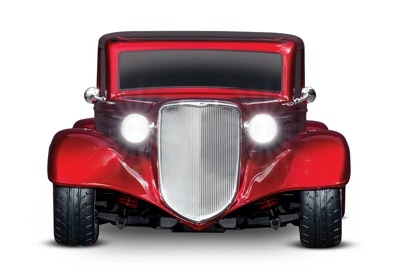 The body of this hot rod uses a deep red finish, detailed graphics, narrow hood design and an aggressive chopped roof. Chrome headlights, grill and side mirrors are included to add to the classic feel of this hot rod. LED head lights and tail lights are waterproof and installed for a perfect fit and finish. Clipless body mounts are used so that no holes are drilled into this stunning body. This hidden mechanism delivers a secure hold, and releases in seconds to provide chassis access.