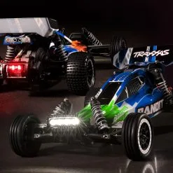 The Traxxas Bandit® elevates RC buggy performance to a whole new level with faster speeds, innovative technology, hobby-grade durability, and a budget-friendly price. Bandit’s sleek, lightweight chassis delivers razor-sharp handling and blazing 35+ MPH* speed with blazing LED lights to guide the way. Pull the trigger and the Bandit rips massive rooster tails, soars over jumps, and lays down the power for excitement at every turn. Equally at home off-road or on pavement, Bandit’s fully waterproof electronics make even the wildest all-weather adventures possible. Step up to genuine Traxxas quality and performance and discover a whole new level of fun with the Traxxas Bandit.